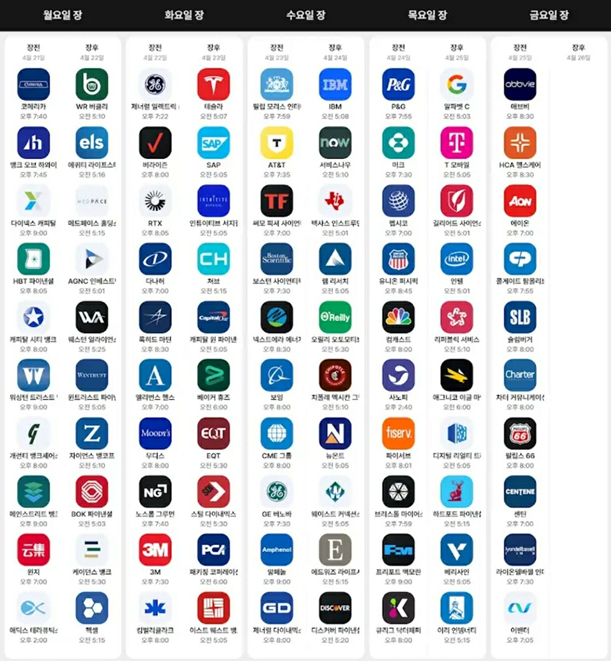 | 4월 23일(수) | 테슬라(Tesla) | 전기차/테크 | EV 수요, 마진, AI 자동차 |